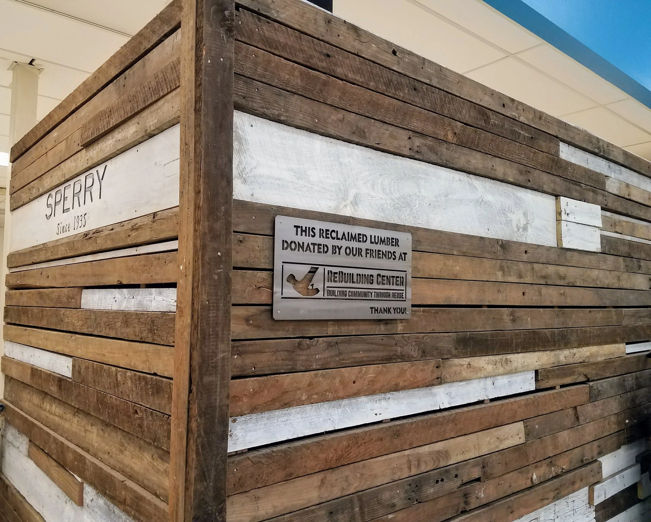 In an effort to add some sustainable character to an otherwise uninteresting box store, the ReBuilding Center donated 350 8 foot 2”x4”s to the project, which were built into beautiful walls that now adorn the space. The ReBuilding Center congratulates ReStore on its newest home in Gresham and continuing to promote a culture of reuse!