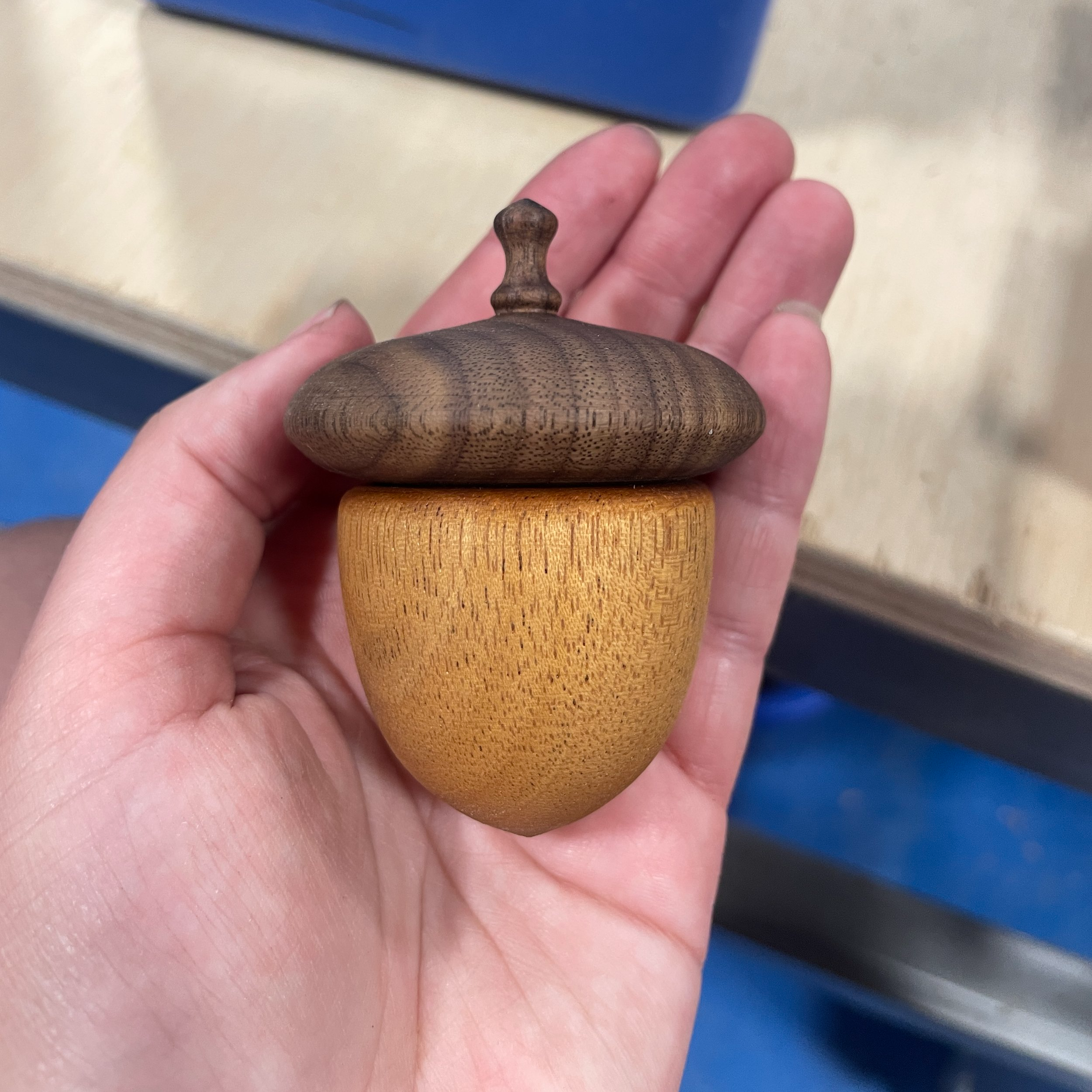 In this beginning woodturning class, create an acorn box! Learn how to use high speed steel and carbide tools, and how to use a drilling attachment on the lathe. Make an acorn hat out of walnut, using measurements to create a perfect seal as the lid of the box. Then shape the main body, hollowing out a small storage compartment to keep special tiny treasures.